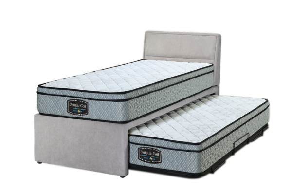 This item can be used as a Single bed, Double bed or 2 single beds. The trundle bed is perfect for when the guests arrive or for any sleep overs. The 2 mattresses are spring mattress and are a medium firmness rating. Guest bed will raise to same height as main bed. The bed simply rolls out on running rollers with the legs can be fold up.